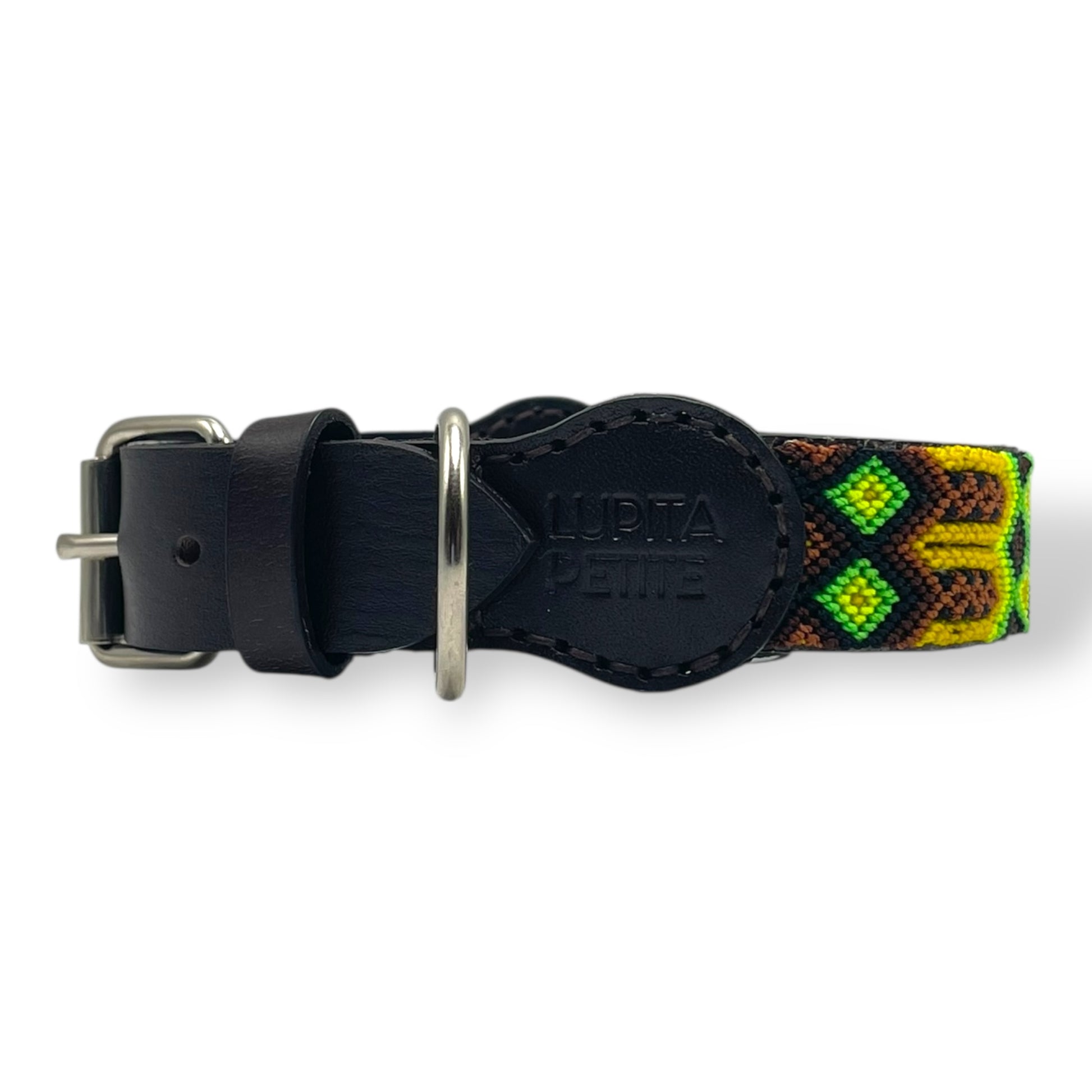 El tejido artesanal de macramé está hecho con hilo nylon muy resistente y la piel es curtido vegetal de tacto suave. Lleva una hebilla y una anilla de hierro. El sistema de hebilla tradicional con agujeros permite ajustarlo perfectamente al cuello de tu perro.