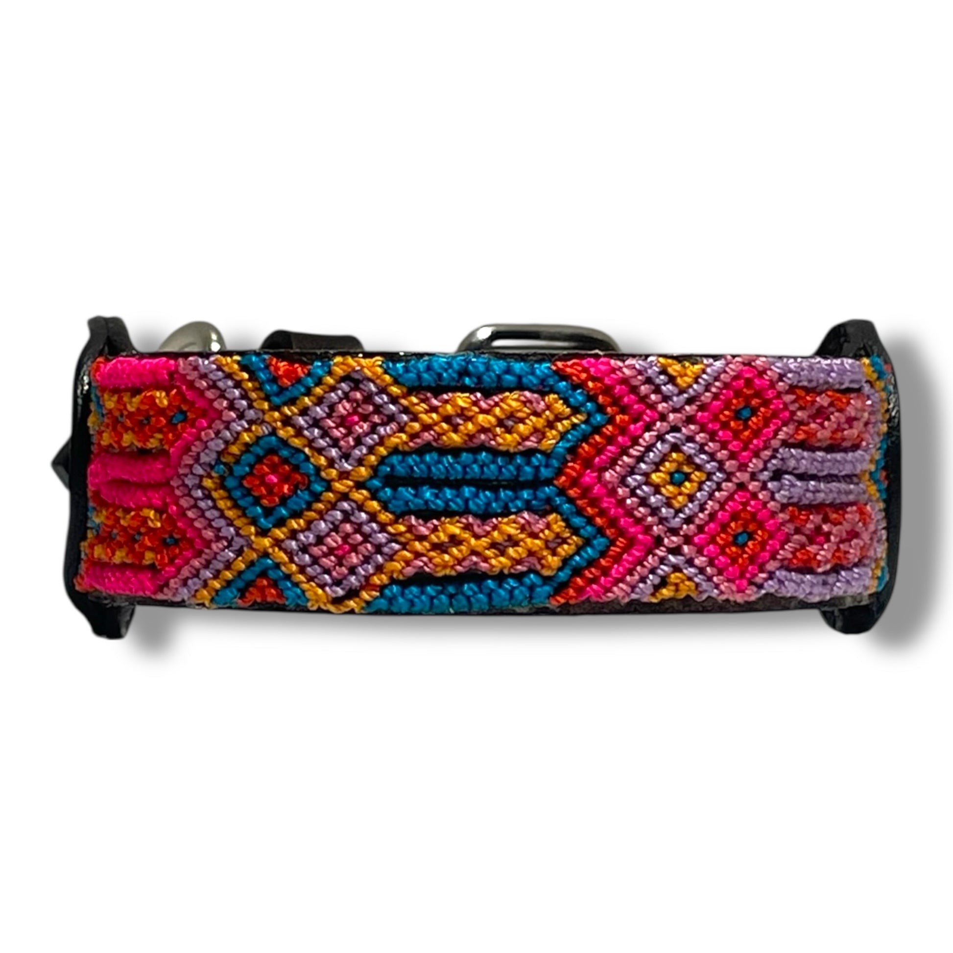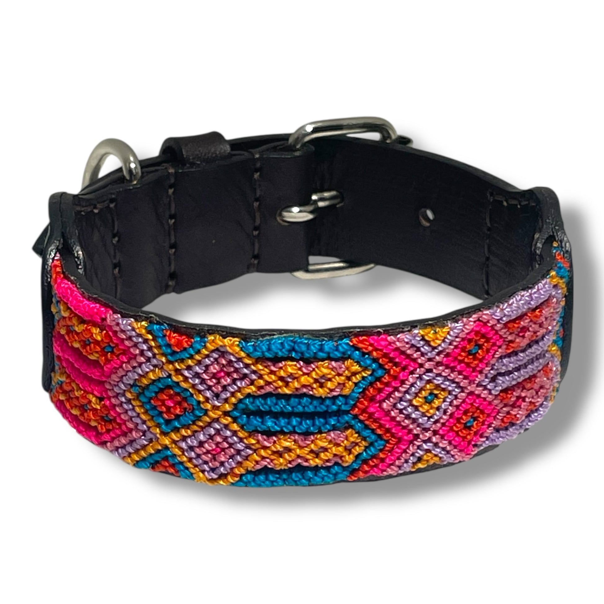 El tejido artesanal de macramé está hecho con hilo nylon muy resistente y la piel es curtido vegetal de tacto suave. Lleva una hebilla y una anilla de hierro. El sistema de hebilla tradicional con agujeros permite ajustarlo perfectamente al cuello de tu perro.