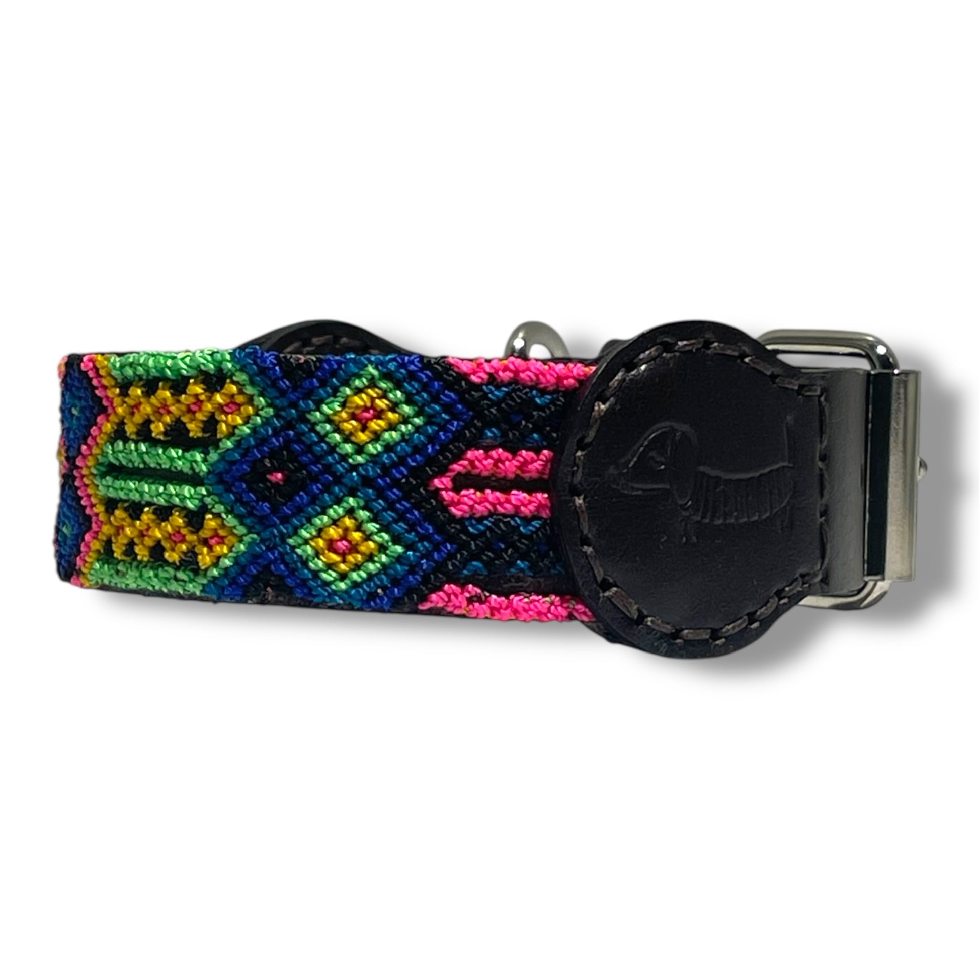 El tejido artesanal de macramé está hecho con hilo nylon muy resistente y la piel es curtido vegetal de tacto suave. Lleva una hebilla y una anilla de hierro. El sistema de hebilla tradicional con agujeros permite ajustarlo perfectamente al cuello de tu perro.