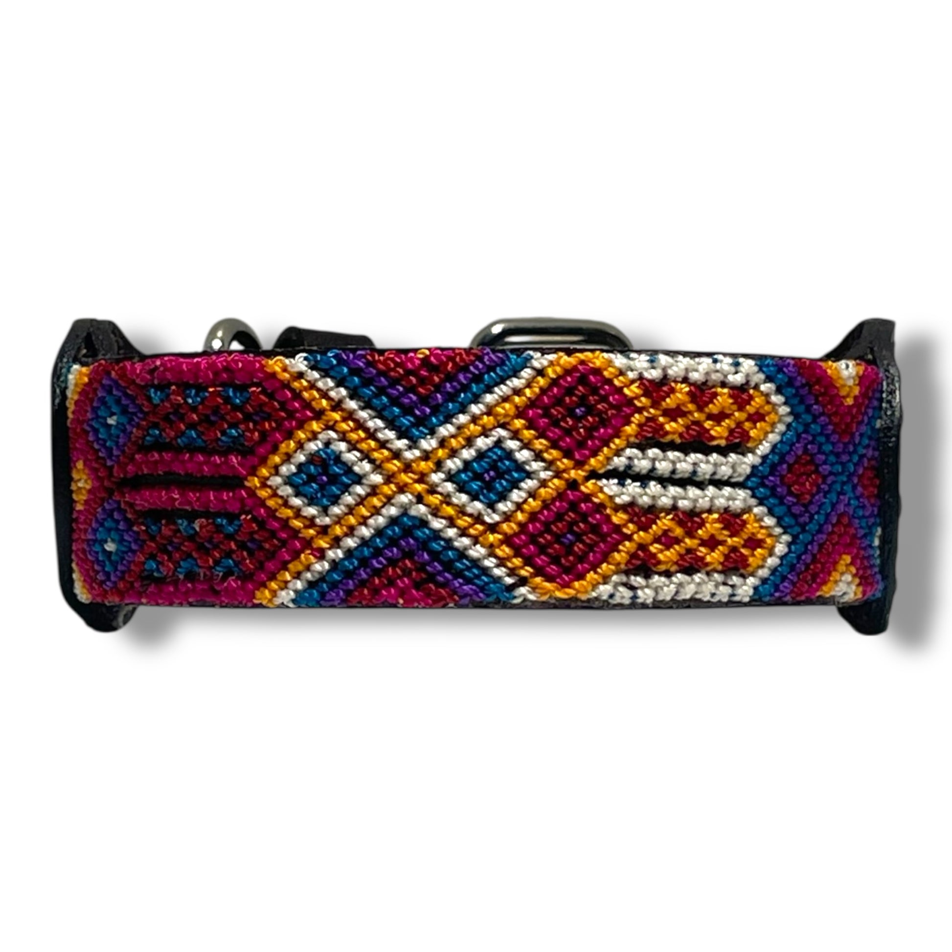 El tejido artesanal de macramé está hecho con hilo nylon muy resistente y la piel es curtido vegetal de tacto suave. Lleva una hebilla y una anilla de hierro. El sistema de hebilla tradicional con agujeros permite ajustarlo perfectamente al cuello de tu perro.