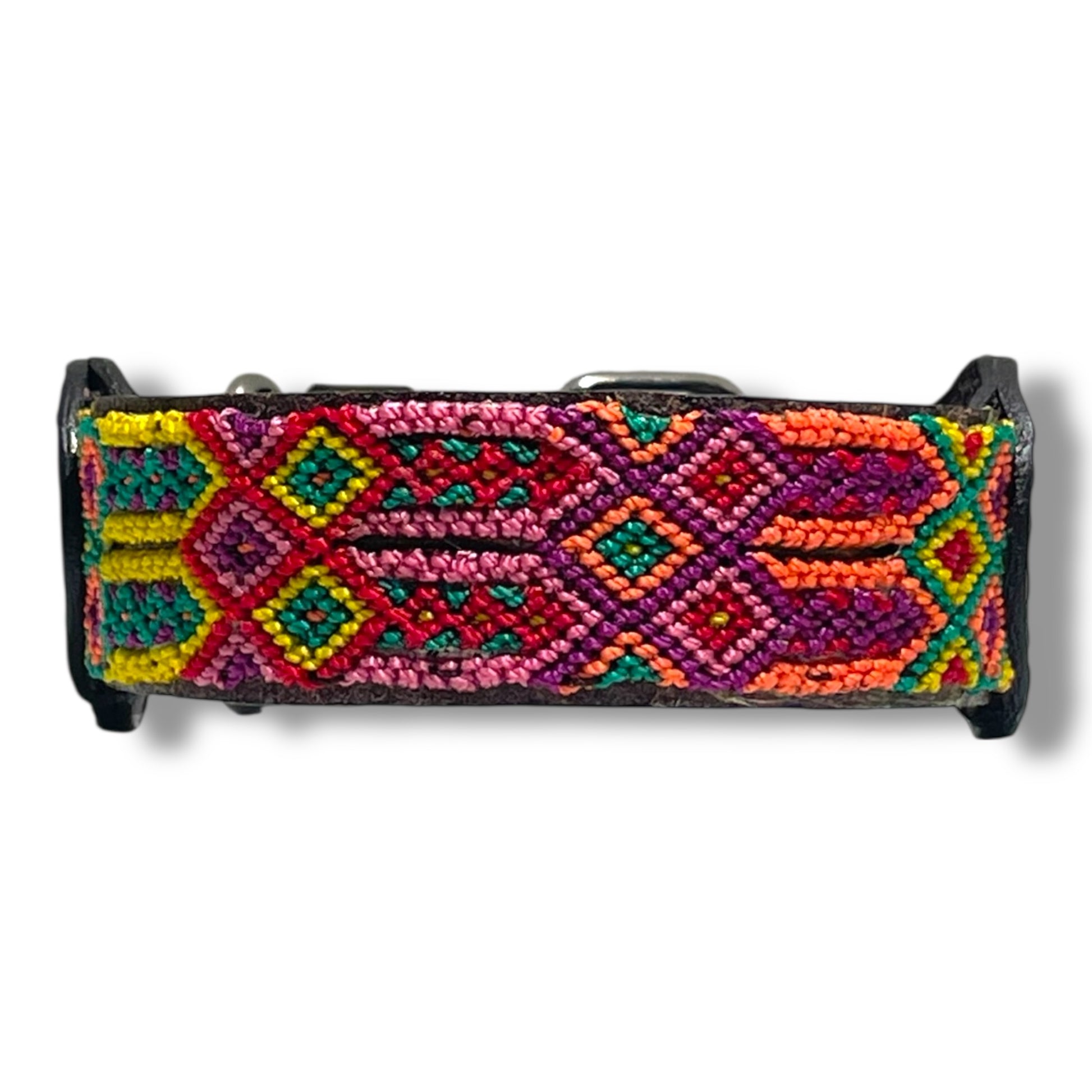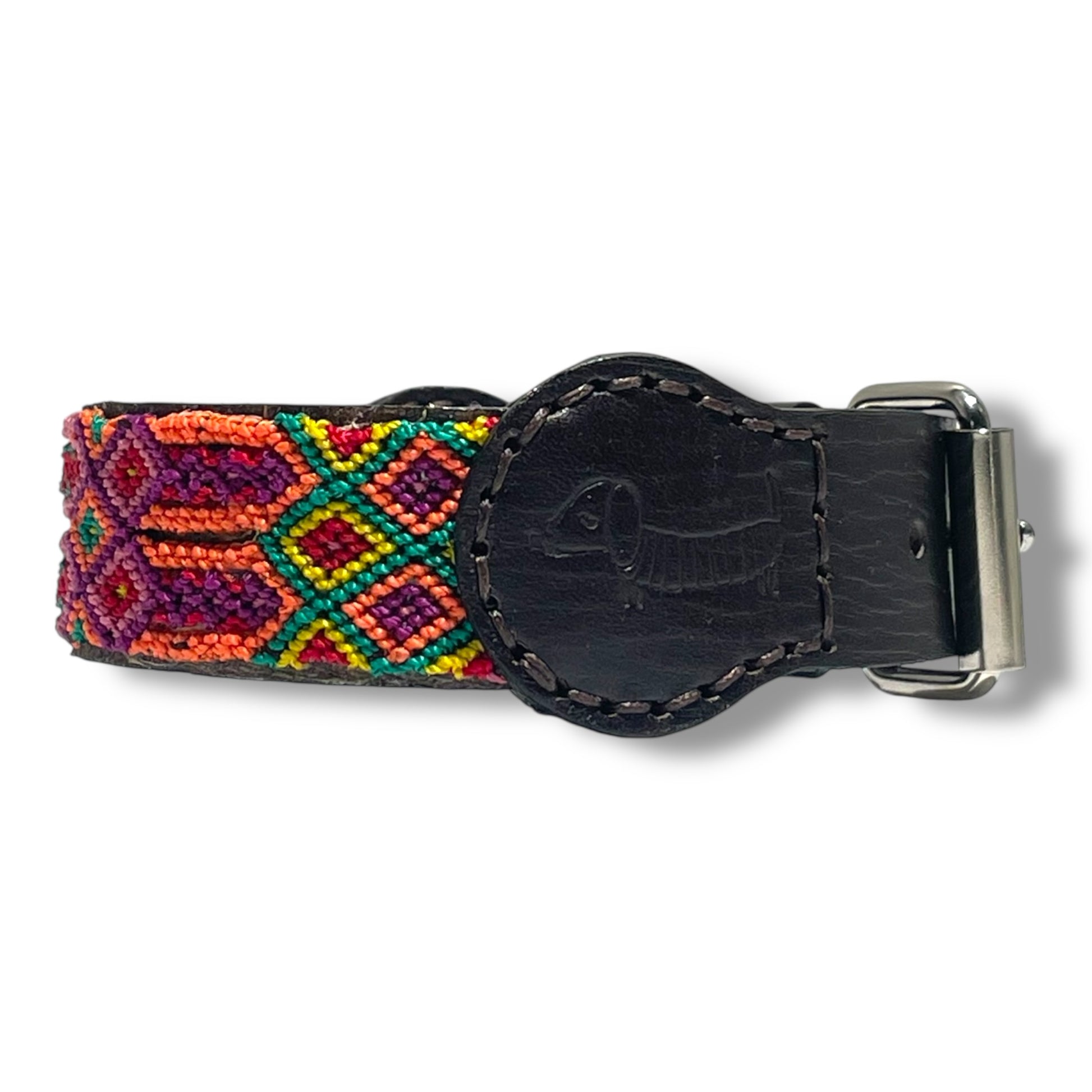 El tejido artesanal de macramé está hecho con hilo nylon muy resistente y la piel es curtido vegetal de tacto suave. Lleva una hebilla y una anilla de hierro. El sistema de hebilla tradicional con agujeros permite ajustarlo perfectamente al cuello de tu perro.