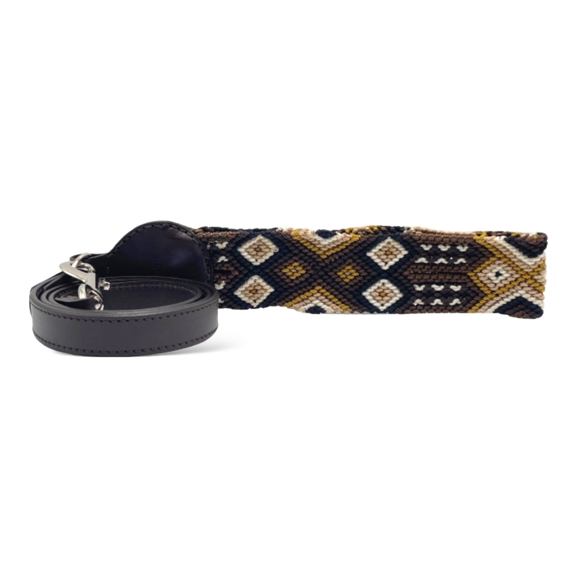 El tejido artesanal de macramé está hecho con hilo nylon muy resistente y la piel es curtido vegetal de tacto suave. Lleva un piquete de hierro para unir el asa con la longitud de la correa, y un mosquetón de hierro para ajustarla al collar de tu perro.
